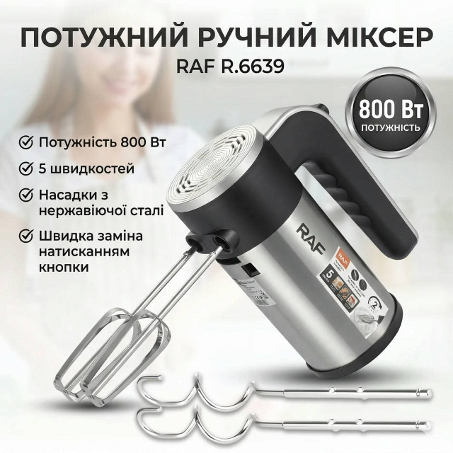 Електричний ручний міксер з регулюванням швидкості та насадками RAF R.6639 800W